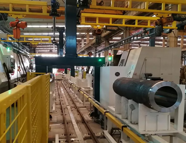作為煤炭采掘設備的核心部件中缸筒,其中缸和外缸尺寸不一,但都是大型設備:最重的有1.5噸,長度達2.5米。在生產過程中,如何對它們進行穩定運輸,并在較短時間內完成多個加工工序成為一大難題。原來各個工序之間的物流都是由工人通過行吊完成,不僅費時費力,而且存在安全隱患。另外,由于加工設備布局分散,物流倒短時間長,導致生產效率難以提高。